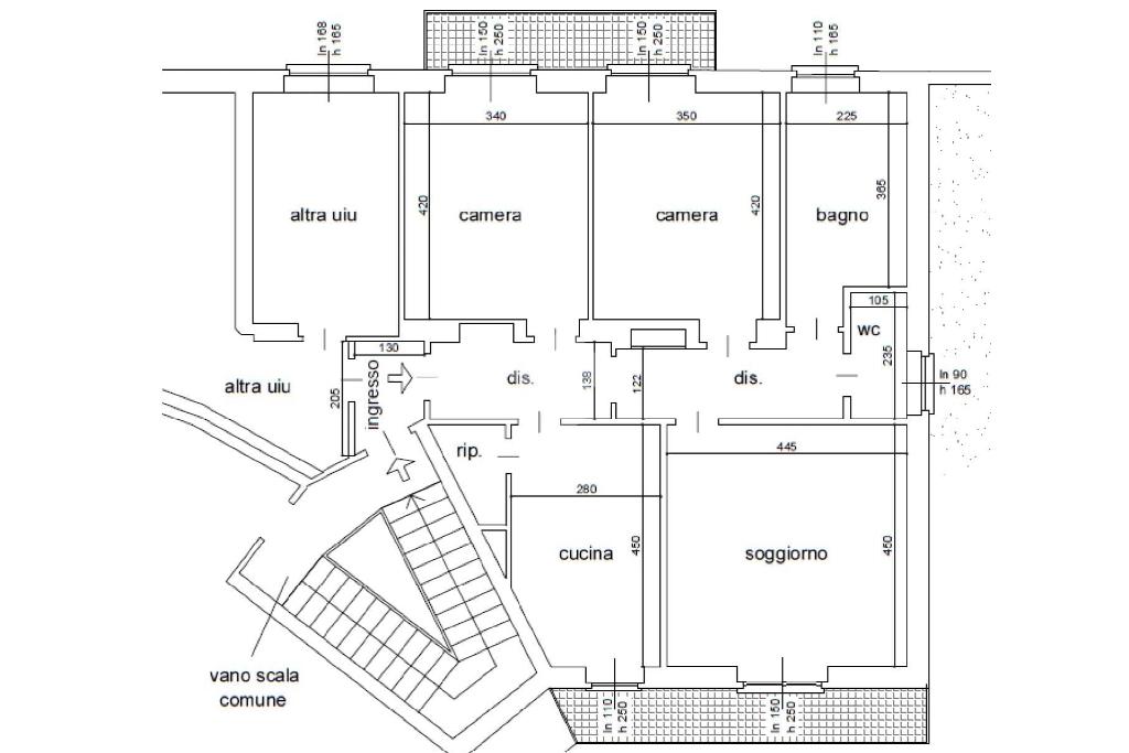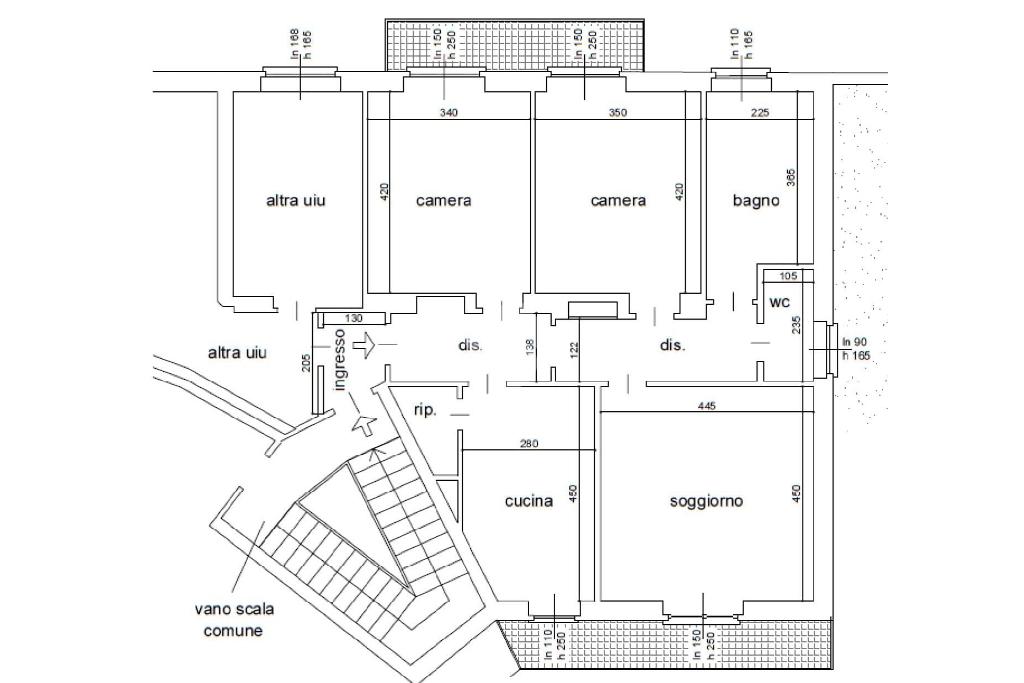 L’ingresso è su un disimpegno che accompagna ai vari ambienti. La cucina è abitabile e affaccia su un primo balcone. La zona notte è composta da due camere da letto di ampie metrature. Il soggiorno è spazioso e luminoso. I servizi sono due, uno dotato di vasca e uno di doccia e sono entrambi finestrati.